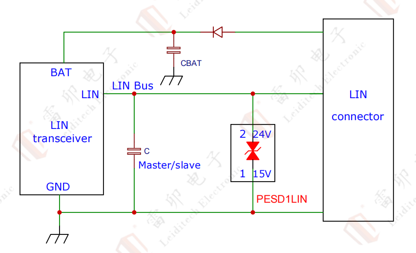 LINExposición del conector de la interfaz del bus y en el entorno externo,Cuando LIN Cuando el autobús entra en contacto con el mundo exterior,El autobús tiene riesgo de choque de alta tensión。Este impacto de alta presión o transitorio puede dañar LIN Transceptores y componentes traseros。