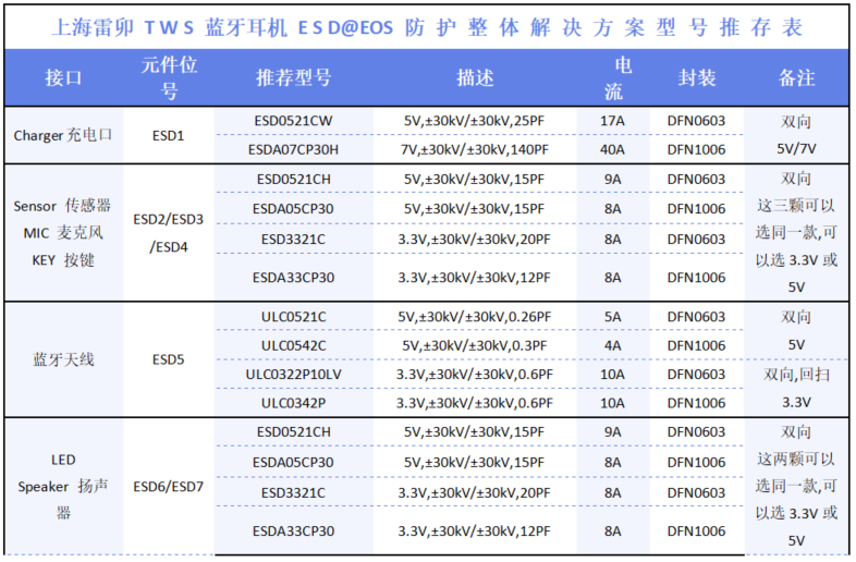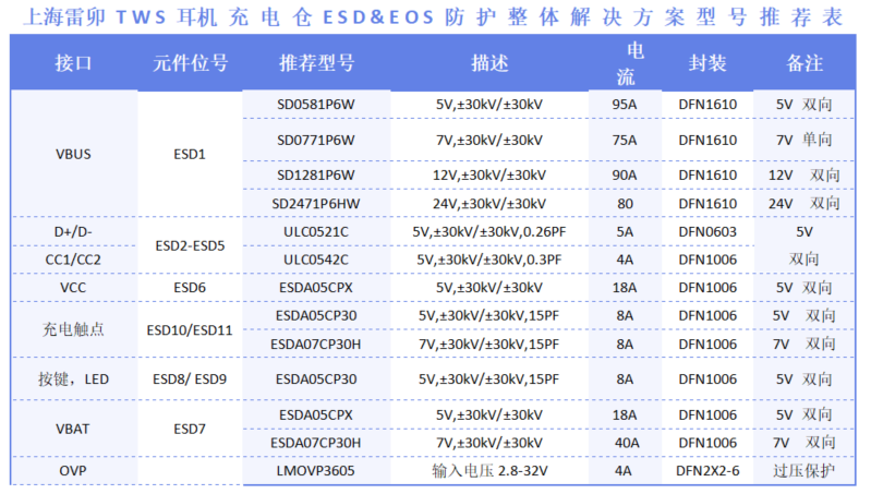 Debido a las limitaciones de espacio y las razones de la portabilidad móvil,TWS El programa de protección de auriculares necesita ser compacto,Baja tolerancia,Baja fuga de electricidad,Dispositivos de protección de alta estabilidad。La mayoría de los componentes del plan recomendado por Shanghai leimao son DFN0603,DFN1006 Encapsulamiento,ParaTWSSe recomienda un pequeño paquete en el puerto de carga de los auricularesDFN1006 alta potenciaESDDispositivos de protección,Para el almacén de carga Vbus, SelecciónDFNEl paquete 1610 tiene cierta resistenciaESDYEOS Rendimiento,Y se pueden elegir varios voltios según la demanda.,Para señales de alta frecuencia como BluetoothAntenaSe recomienda llevar el barrido de vuelta con un pequeño paquete de baja capacidad.ESD Dispositivos de protección,Puede proteger mejor el nivel posteriorChip,En respuesta a la necesidad de una baja corriente de fuga,TodosESDDispositivos de protección IR <0.1uA。Por lo tanto,Este esquema es muy adecuado.TWS Auriculares Bluetooth y otros productos portátiles。
